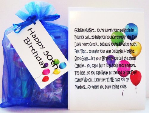 50TH BIRTHDAY SURVIVAL KIT BLUE - ORGANZA BAG MEASURES APPROX. 16 X 11 CM POSTCARD MEASURES 14 X 11 CM. An ideal fun, novelty gift for A 50TH Birthday. The post card & envelope includes a contents list which explains the humourous sentiment of the objects in the bag.