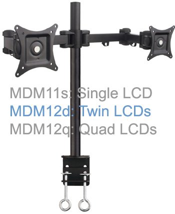 MDM12D Dual LED/LCD Monitor Arm Stand Tilt Swivel Rotate - The MDM12D is the desk mount bracket for two 15" to 27" LCD monitors. Two monitors to be mount on one desktop side-by-side in one row. It is the twin monitors version of the Allcam MDM1X series (MDM11, MDM12 ...) multiple monitor desk mount bracket with the same black finish, same modules, same features, and same mounting method. The Allcam MDM1X series multiple LCD desktop mount bracket are carefully designed in modules: Pole module (with clamp and cable holders): short pole 44cm (default, MDM
