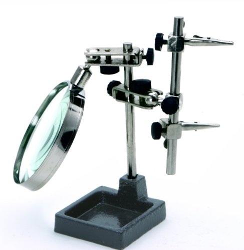 Rolson 60338 Helping Hand with 90mm Magnifying Glass - Ideal for any application where a "third-hand" is needed. The practical helper for soldering work, electronics and model making. An indispensable aid for model-makers, do-it-yourself-ers, or professionals. . - Holding clamps adjust in many ways. - Adjustable joints for versatile movement in all directions. - Strong crocodile clamps hold work secure. - Complete with distortion free magnifying glass. - Sturdy stand