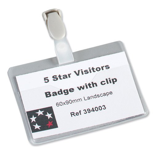 5 Star Office Name Badges Visitors Landscape with Plastic Clip 60x90mm (Pack 25) - Visitors badges. Transparent with blank inserts for self-labelling. With plastic clip. Landscape. Size: 60x90mm. Quantity 25