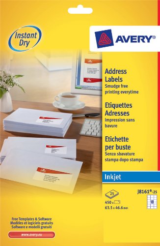 - Avery Inkjet Addressing Labels. Quick DRY for smudge free performance. Ensures vivid colour and sharp text - no feathering. Guaranteed for all popular inkjet printers. 63.5x46.6mm White Ref J8161-25 [450 Labels].