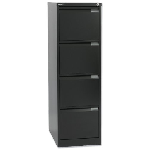 Bisley BS4E Filing Cabinet Flush-front 4-Drawer W470xD622xH1321mm Black Ref BS4E-33 - The Bisley Filing Cabinet BS4E is a 4 drawer steel suspension filing cabinet. This filing cabinet features a full welded construction with heavy duty drawers making it a robust storage solution. The drawers extend fully to give greater capacity as well as complete access to contents. This Bisley Filing Cabinet BS4E features an anti-tilt device, meaning that only one drawer can be opened at a time thus avoiding any danger of the cabinet overbalancing and falling onto the user. This cabinet