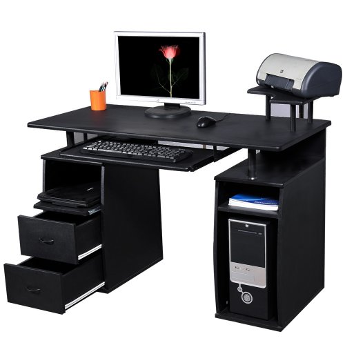 (BTM) LARGE Computer Desk with 2 Drawers and 4 Shelves for Home Office Study Workstation Furniture PC Desktop Office Chair Table FILING CABINET BLACK LARGE NEW - This laminate MDF desk would make a stunning addition to your home or office. It comes with 2 drawers and a slide out shelf above it for a scanner. There is a smooth sliding shelf for your keyboard. There is also a space to keep your PC base and a raised platform on the desktop for a printer or monitor. This desk has a solid build design and with the build quality being made to the highest standard it is extremely hardwearing and durable. It weighs around 45kg making it very stable.