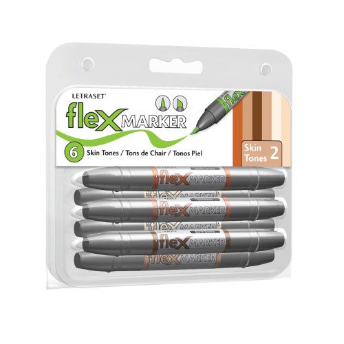Flex FMSPSKIN2 Brush Tip Marker - Skin (Set of 6) - The Letraset FlexMarker Set #2 of 6 Skin Tones includes Saddle Brown, Cinnamon, Nutmeg, Burnt Sienna, Light Fawn, and Blush. These colors were selected by their tones and are designed to complement each other. FlexMarkers have one end with a broad nib for large color fills, plus a flexible brush nib for fluid strokes. The alcohol-based, permanent, translucent inks can be overlaid and blended easily. Use on paper, vellum, glass, wood, metal and plastic.