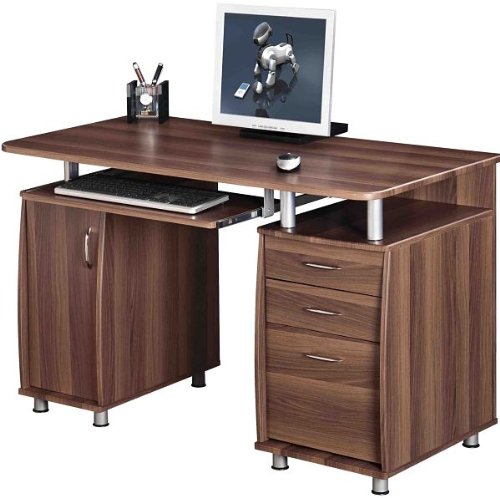 Piranha PC2w Large Computer Desk with 3 Drawers and a Cabinet - Large computer desk with three drawers and a cabinet with a door, with one height adjustable shelf. Smooth pull out keyboard shelf with additional storage space directly under the main desk top. Made from replica dark walnut laminated MDF. * These desks offer a generous working surface of 120cm x 61cm (47.5" x 24"). For full dimensions please see the diagram above. * Easy to assemble with full instructions included. No additional tools needed. * With a solid build design and weight