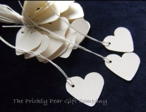Small Cream Heart Tie On Price Tags- create strung tags for jewellery and small gifts - Pack of 100 Cream UNSTRUNG small heart tags. String ties provided loose to allow you to tie as you wish. Perfect for jewellery sellers, small gifts or to use for wedding and new baby favours. Approx. 2.5cm width x 2cm height. More lovely tags available from The Prickly Pear Gift Company.