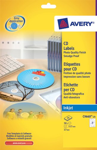Avery Full Face CD Labels- Photo Quality Glossy - Glossy photo quality inkjet CD labels give the impression of directly printing onto the disc. Pre-designs available to ensure a professional finish. Compatible with the Avery CD/DVD COMBI labelling kit. Dia.
